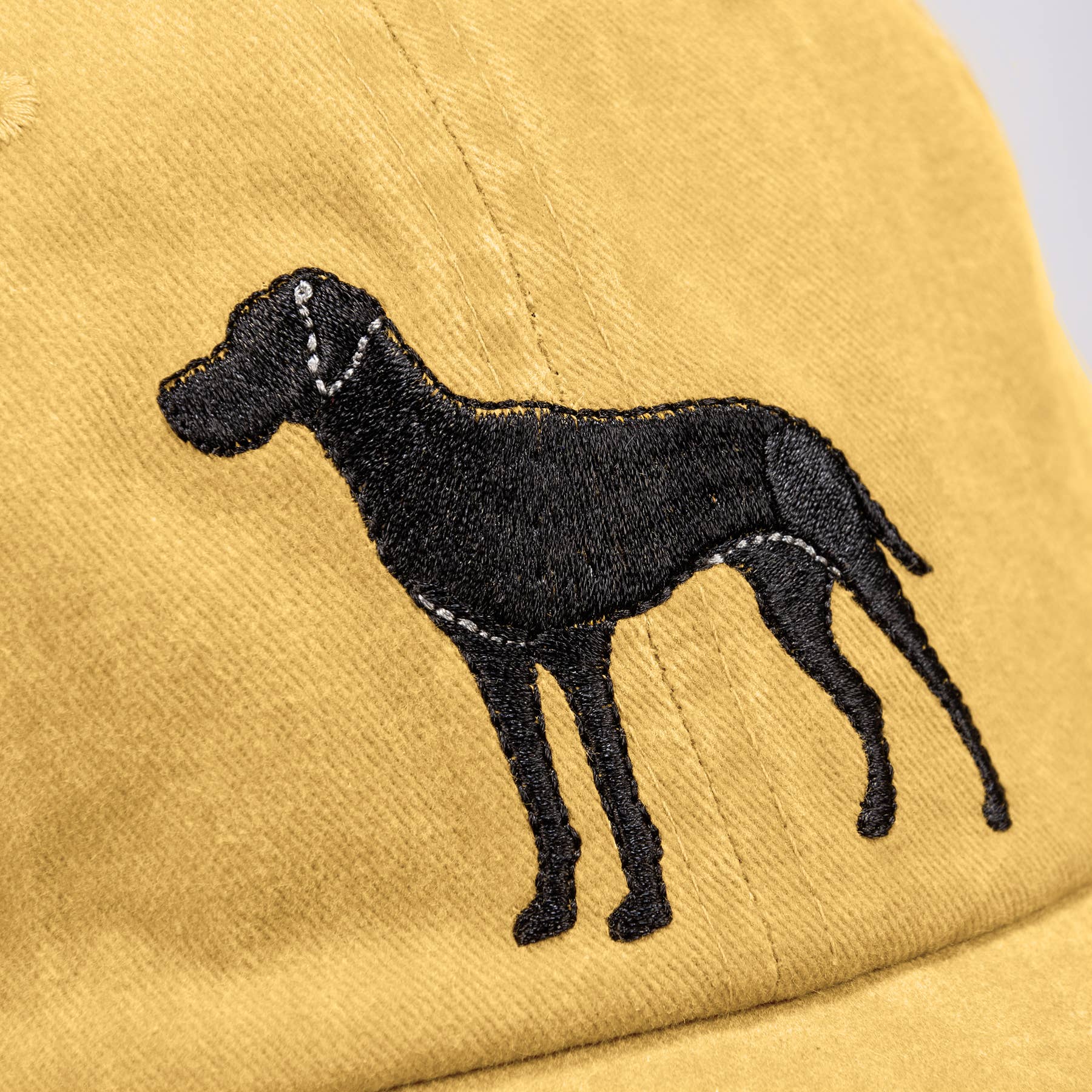 A cotton baseball cap from our Pet Collection with an adjustable brass closure. Features an embroidered great dane design on the front and "Love My Great Dane" sentiment on the reverse side. Cap is one size fits most and hand-wash only. The Love My Great Dane hat coordinates with our Best Great Dane Ever Pet Bandana for matching dog and owner outfits.